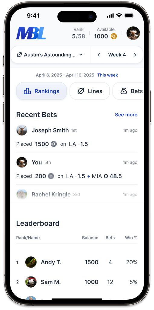 MBL combines the fun of fantasy sports with wagering-style competition—without the real-money gambling. Players compete by picking games and placing virtual wagers. At the end of a league, the player with the most funds wins.